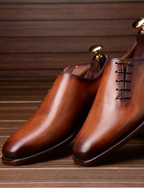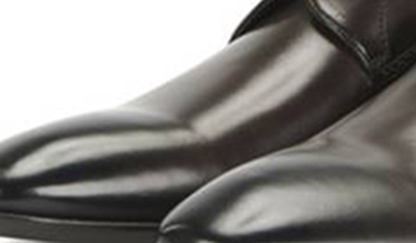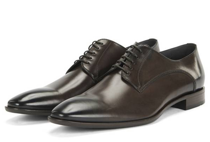 由擦色納帕革飾層制成的真皮德比鞋,鞋頭采用折疊真皮設(shè)計,真皮內(nèi)層和縫線粘合的橡膠鞋底。